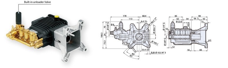 Coated Stainless steel pisntons in brass head Pump include a build-in unloader valve, chemical injection and Easy-Start System.